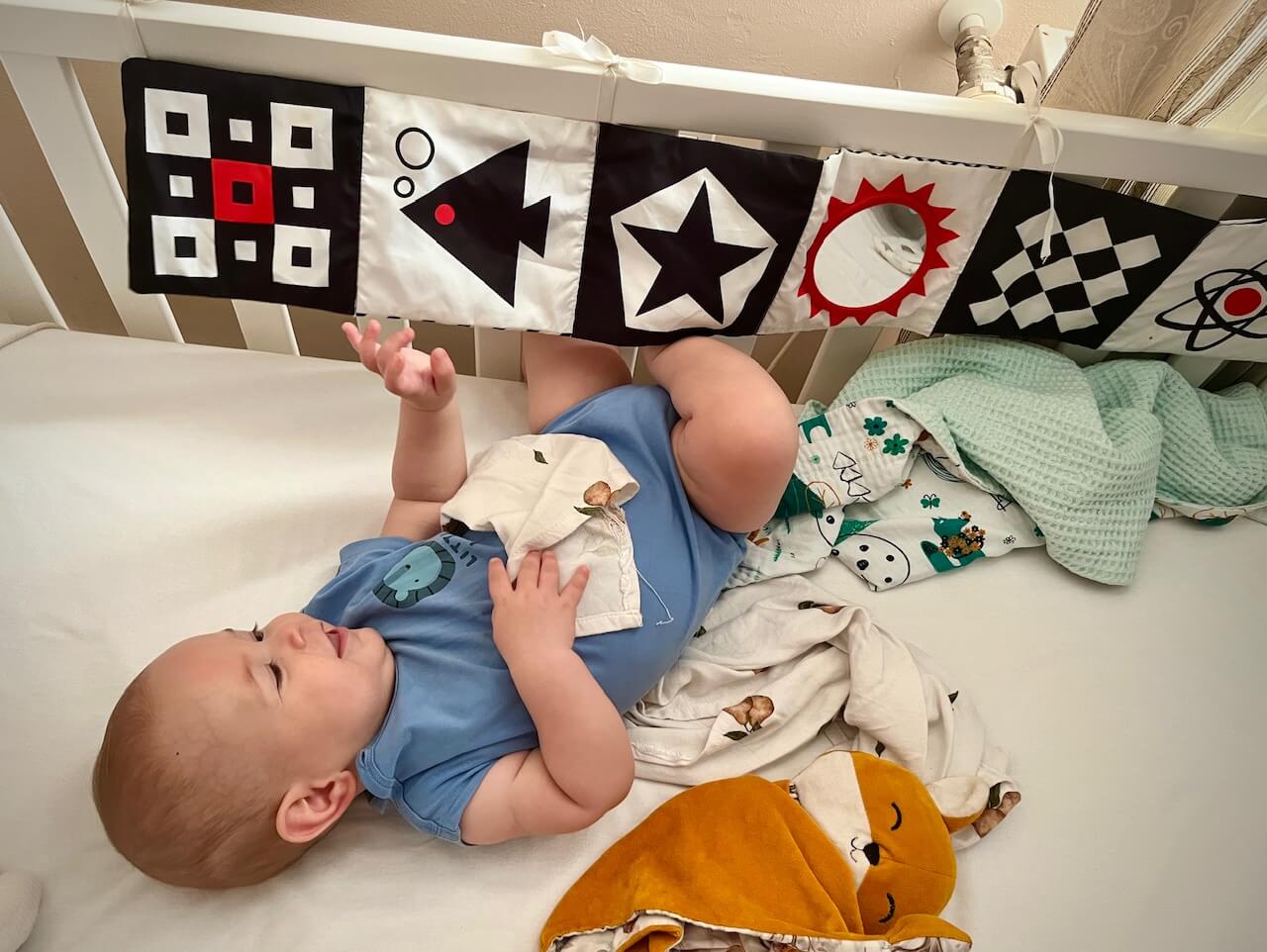 Az újszülöttek látása kezdetben homályos, szemeik mozgása csak 3 hónapos korra lesz összehangolt, viszont a kontrasztokat jól érzékelik. Ez a különleges, kihajtható könyvecske igazi varázslat a számukra, hiszen a fekete-fehér képeket könnyen felfedezik. A vonalak ritmikus változása fejleszti a szemmozgásokat, a kontrasztos minták pedig a fókuszálás képességét és az éleslátást. Helyezd neki a kiságyába, járókába vagy a matatószőnyegre.