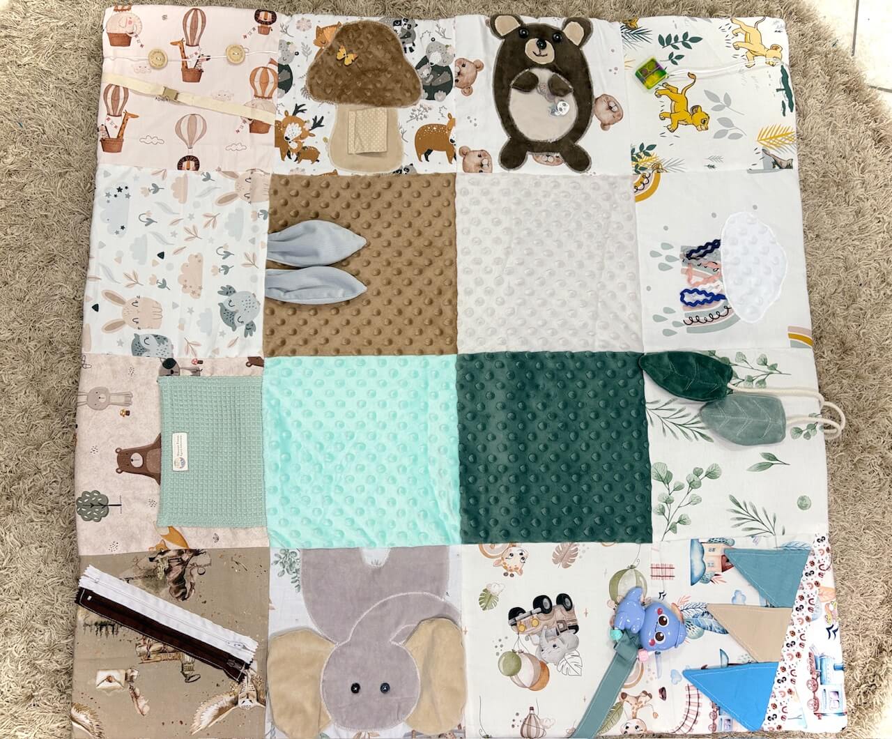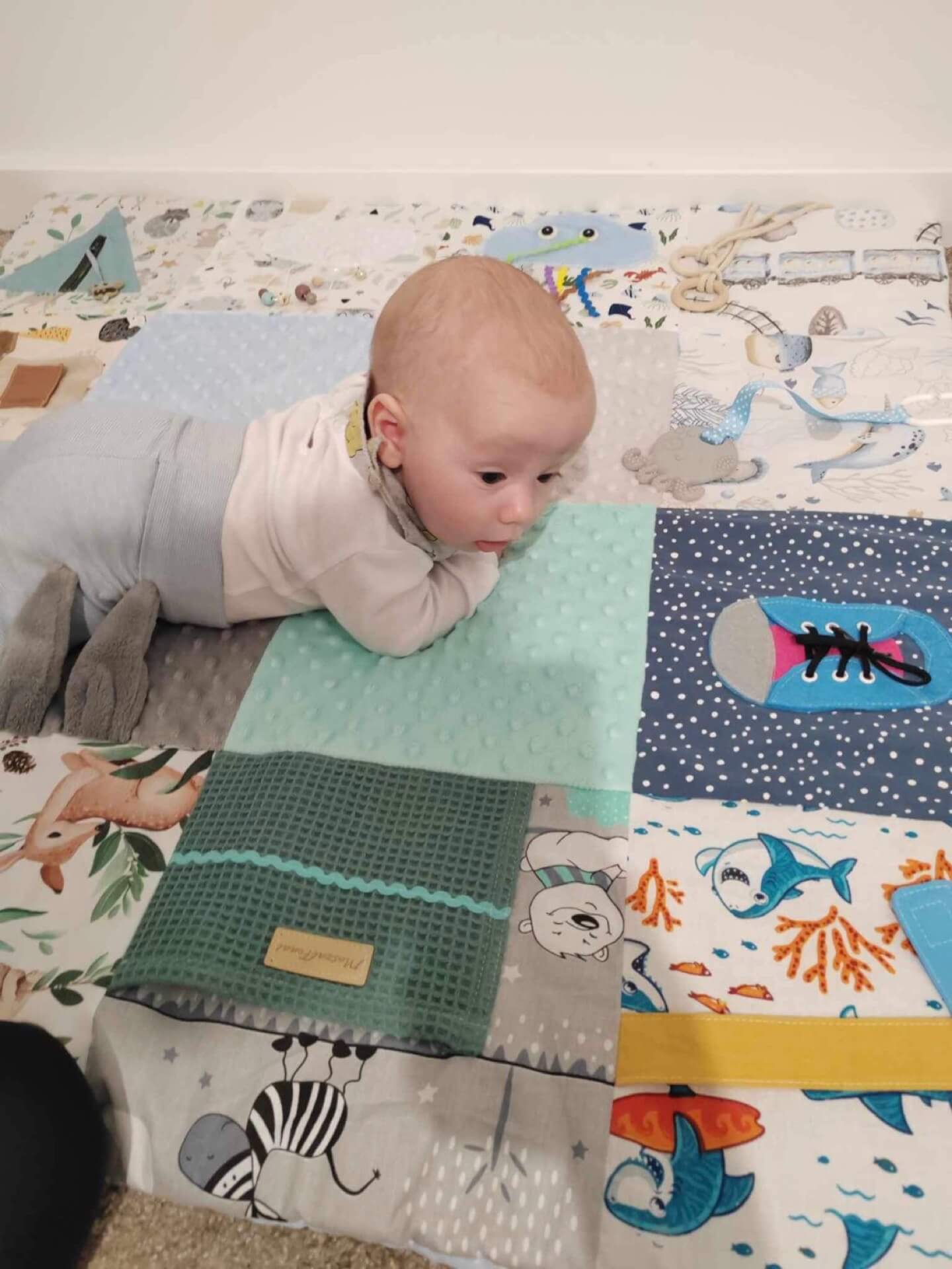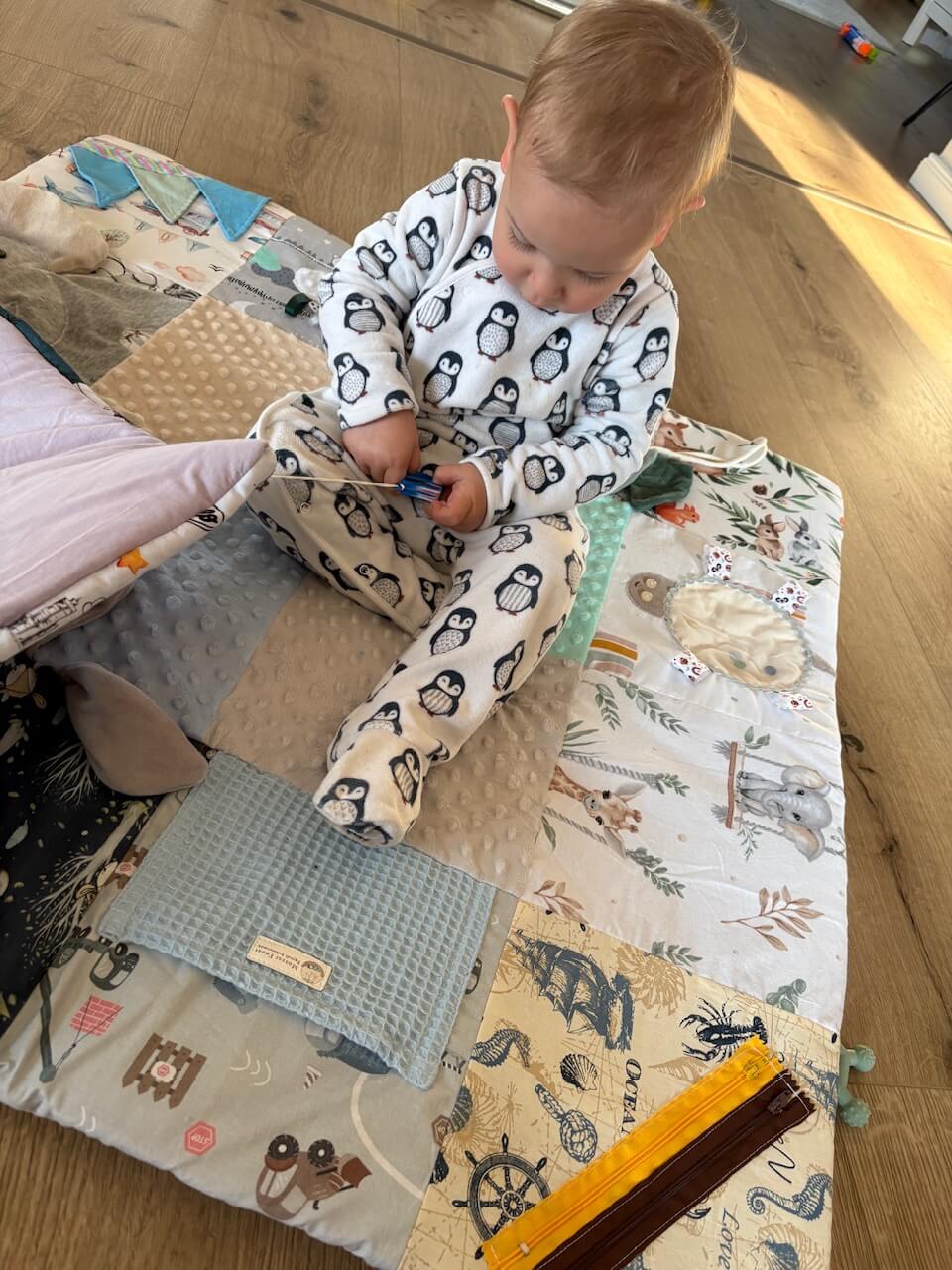 A Waldorf alapokon nyugvó matatószőnyeg játékosan fejleszti az érzékszerveket, finom motorikát, egészen újszülött kortól. A színes minták, különböző textúrák, csörgő – zörgő matatni-valók, cipzárak, gombok, csatok felkeltik a picik érdeklődését, számos visszajelzést kaptunk róla, hogy segített a hasra fordulásban, mert a baba érdekesnek találta. Minden szőnyeg egyedileg készül a zero – waste jegyében, így nincs két egyforma. Az apróságokat gondosan, többszöri varrással rögzítjük, ennek ellenére nem szabad a picit felügyelet nélkül hagyni a szőnyegen. Minden szőnyeg tartalmaz levehető rágókát, mely bababarát szilikonból készül és enyhíti a fogzás okozta fájdalmakat. A szőnyeg 3 cm vastag vatelin réteggel van ellátva, mely a padló felől védelmet nyújt a hideggel szemben, kellően puha kényelmes fekhelyet biztosít és hosszú időre leköti a pici figyelmét.