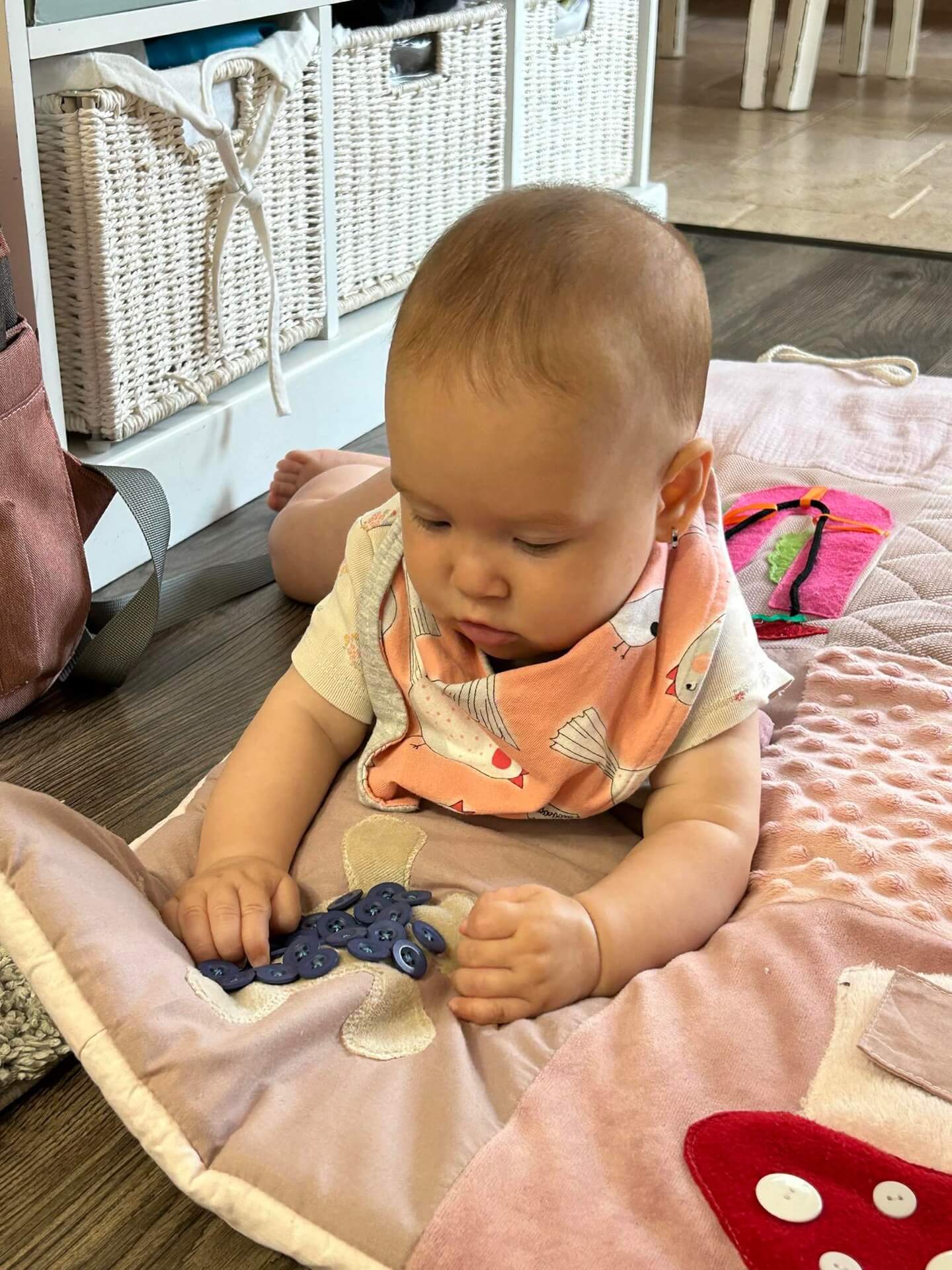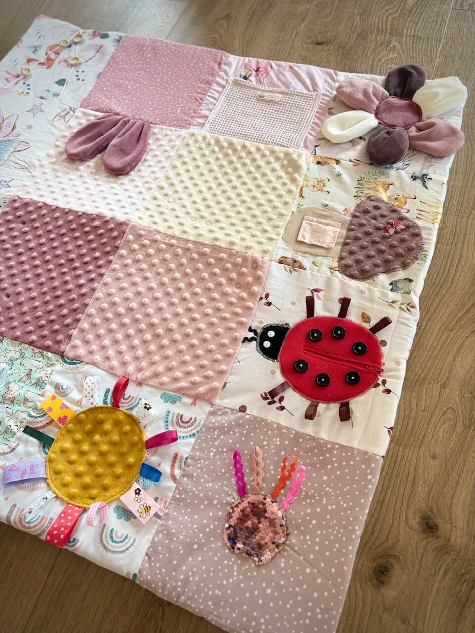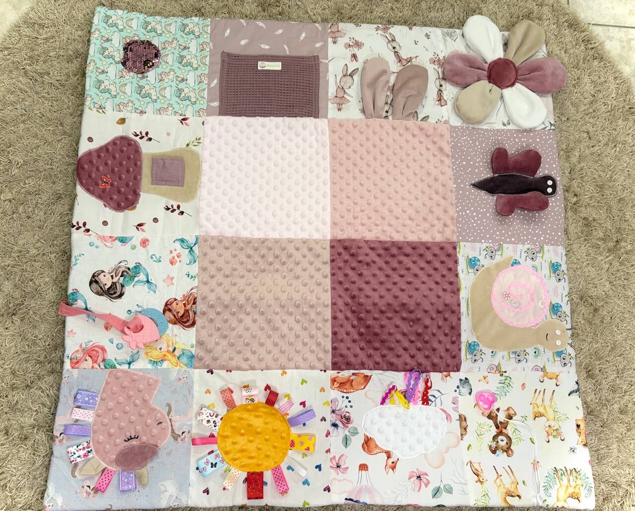 A Waldorf alapokon nyugvó matatószőnyeg játékosan fejleszti az érzékszerveket, finom motorikát, egészen újszülött kortól. A színes minták, különböző textúrák, csörgő – zörgő matatni-valók, cipzárak, gombok, csatok felkeltik a picik érdeklődését, számos visszajelzést kaptunk róla, hogy segített a hasra fordulásban, mert a baba érdekesnek találta. Minden szőnyeg egyedileg készül a zero – waste jegyében, így nincs két egyforma. Az apróságokat gondosan, többszöri varrással rögzítjük, ennek ellenére nem szabad a picit felügyelet nélkül hagyni a szőnyegen. Minden szőnyeg tartalmaz levehető rágókát, mely bababarát szilikonból készül és enyhíti a fogzás okozta fájdalmakat. A szőnyeg 3 cm vastag vatelin réteggel van ellátva, mely a padló felől védelmet nyújt a hideggel szemben, kellően puha kényelmes fekhelyet biztosít és hosszú időre leköti a pici figyelmét.