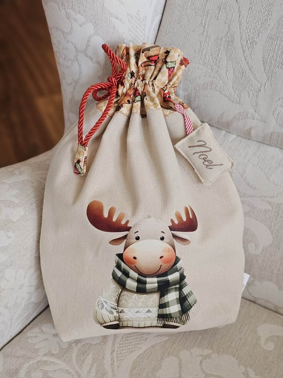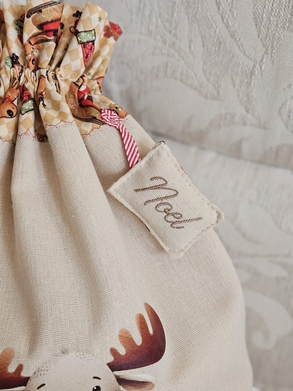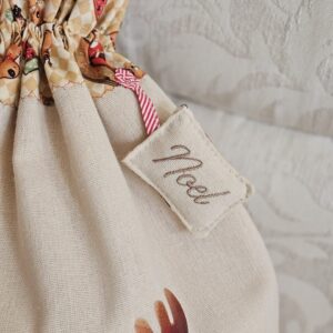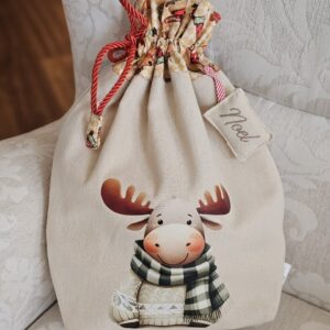 Vászonból készült, hátul kis zsebbel díszített Mikulás zsák, amibe a gyerekek levelet vagy rajzot tehetnek a Mikulásnak a várakozás időszakában.